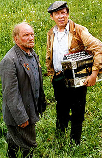 — Да, он шел по Садовому кольцу в колонне пленных, когда их в 44-м через всю Москву гнали, а после этого Лефортовский дворец реставрировал — чистил белокаменные пилястры, белил и штукатурил стены. Иногда двое пленных заходили к нам домой попросить «вассер» — воды, но было понятно, что они хотят есть. Мама наливала им борща или молока, отрезала полученного в скудном пайке хлеба. С Василием Шукшиным в «Калине красной», 1973 год | Однажды за спиной этих двоих показался третий, и в нем я узнал того летчика, подмигнувшего мне левым глазом. От угощения, правда, он отказался, и напарник, пожав плечами, выпил его молоко, а хлеб спрятал в карман.