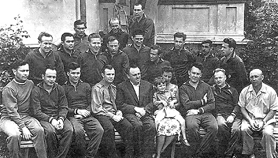 Первый отряд советских космонавтов в неполном составе. Сидят в первом ряду слева направо: Павел Попович, Виктор Горбатко, Евгений Хрунов, Юрий Гагарин, Сергей Павлович Королев, его жена Нина Королева с дочкой Поповича Наташей, Евгений Карпов, Николай Никитин (тренер по парашютной подготовке), Евгений Федоров (врач). Стоят во втором ряду слева направо: Алексей Леонов, Андриян Николаев, Марс Рафиков, Дмитрий Заикин, Борис Волынов, Герман Титов, Григорий Нелюбов, Валерий Быковский, Георгий Шонин. В заднем ряду слева направо: Валентин Филатьев, Иван Аникеев и Павел Беляев. Май 1961 г., Сочи |