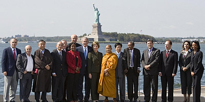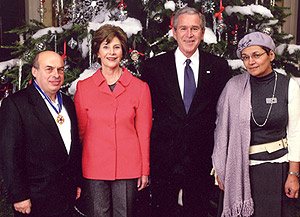 Дмитрий, говорю это как человек, который всегда считал и считает: прочный мир не строится только на силе нашей армии — необходимо, чтобы все народы были здесь счастливы, и палестинцы ничуть не меньше нас заслуживают права жить при демократии. Проблема в том, что свободный мир постоянно ищет возможности ударить по рукам с диктаторами. В свое время, в начале мирного процесса, и наши руководители говорили: «Как хорошо, что Арафат — диктатор, потому что своими диктаторскими методами он расправится с террористами Хамаса намного лучше, чем мы». Мы знаем, что в результате вышло... Чета Бушей и супруги Щаранские встречают Рождество |