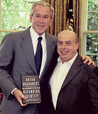 — Думаю, усиление власти ФСБ очень заметно, но не стал бы ее роль преувеличивать... Раньше существовал режим с миллионами рабов в ГУЛАГе и таким же числом работающих на КГБ стукачей и сексотов — режим, контролирующий сознание каждого человека страхом. Сегодня ничего подобного, слава Богу, пока нет, тем не менее любые подвижки в этом направлении крайне опасны. В том, что сегодня ограничена, пусть и частично, свобода печати и независимость судов под вопросом, я вижу огромную угрозу, и, конечно, не может не тревожить судьба Ходорковского. Президент США держит в руках книгу Натана Щаранского «В защиту демократии» — «Джордж Буш-младший был одним из первых ее читателей» |