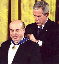 — Я был оптимистом, когда сидел в карцере, и хочу остаться таким сегодня, но положение его очень трудное... С одной стороны, нам было несравнимо хуже, потому что у него все-таки есть через адвоката связь с миром и тот может как-то следить за ситуацией, а с другой — у Запада нет такой однозначной готовности бороться за его свободу, как это было в моем случае и некоторых других.  Джордж Буш-младший надевает Натану Щаранскому президентскую «Медаль Свободы» | Да, я за него опасаюсь, и все же надеюсь, что Россия, которая в итоге-то, что бы там ни было, стремится к партнерству со свободными демократиями, в конце концов поймет, что освобождение Ходорковского — очень важный шаг в налаживании такого сотрудничества. Тут, правда, многое зависит и от позиции Запада.